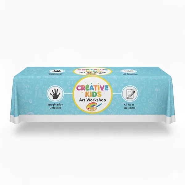 A custom tablecloth instantly transforms a plain table into a professional display that highlights your brand and creates a welcoming space for visitors.